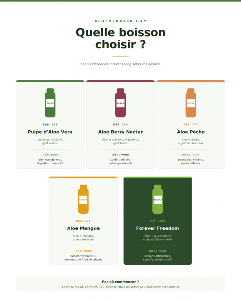 Forever Living propose plusieurs boissons d’aloe vera, chacune adaptée à un besoin spécifique :