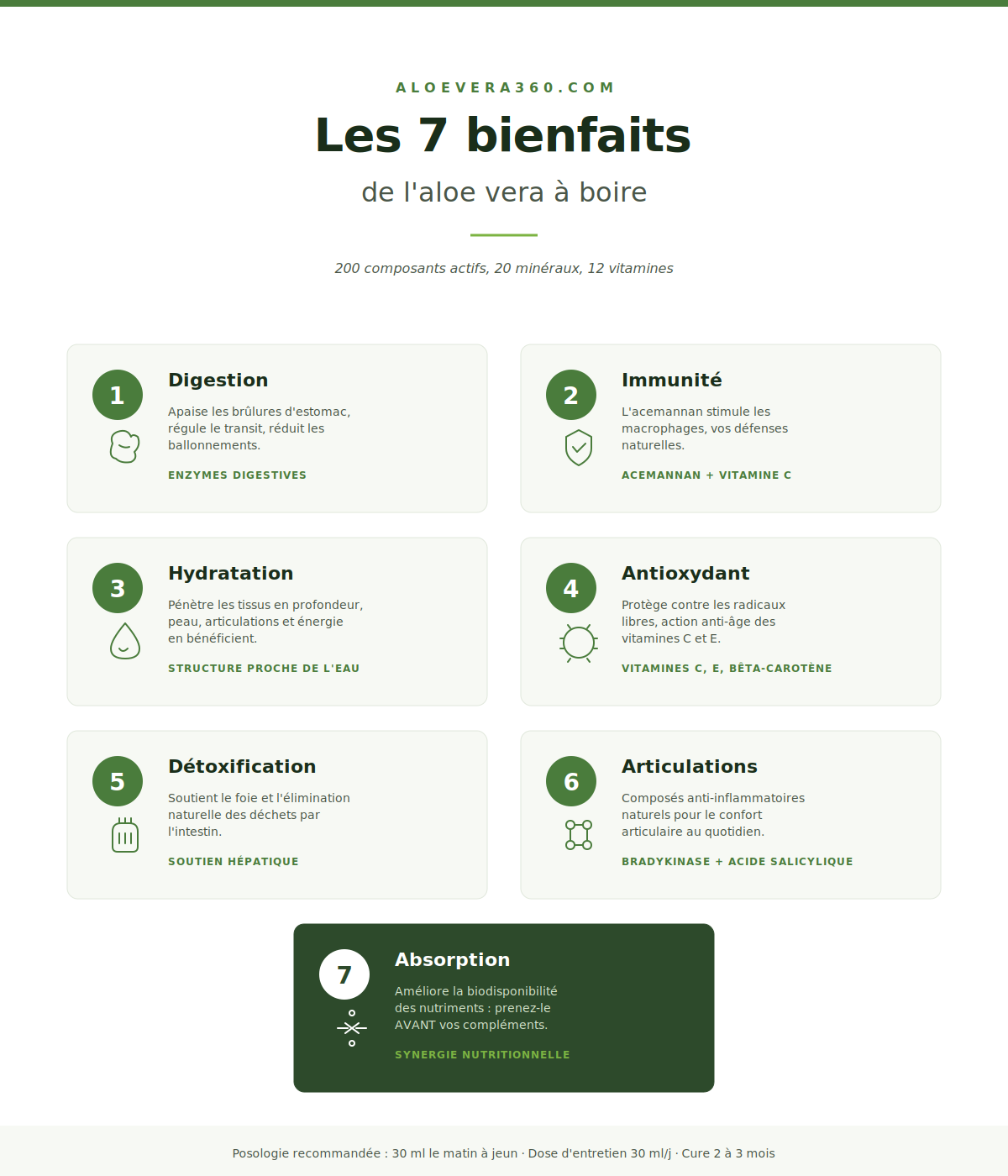 L’aloe vera à boire est l’un des compléments naturels les plus polyvalents qui existent. Digestion, immunité, hydratation, énergie — ses bienfaits touchent l’ensemble de l’organisme. La clé est de choisir un produit de qualité, certifié, et de le consommer régulièrement.