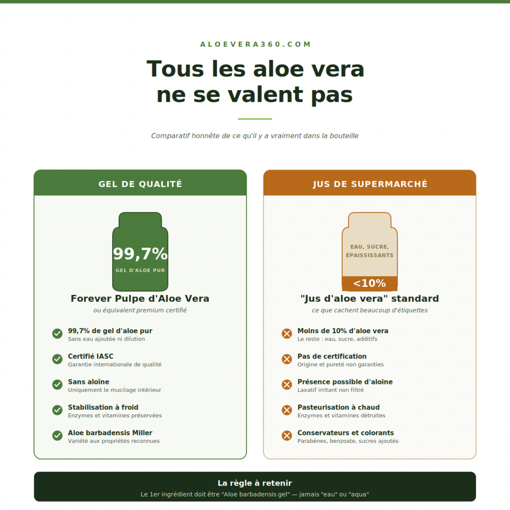 Le terme « jus » est souvent utilisé pour des produits dilués (aloe vera + eau + additifs). Le terme « gel » ou « pulpe » désigne le mucilage pur extrait de la feuille. Privilégiez toujours les produits étiquetés « gel » ou « pulpe » avec une concentration supérieure à 90%.